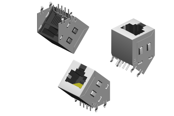 Modular Jack Single port, RJ45 Type 8P8C, THT, 45° Entry, Shielded, w-o LED, w-o Filter