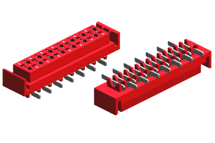 MMF - xxx - HL50 - 99/X Mini-Mate™ "female" connector, pitch 1.27mm interstitial (offset) in SMT technology as "Latch Shape" version with snap-in lugs. Reverse polarity / twist protection by means of a notch on one side. To accommodate the polarization nose of the "male" connector, an additional hole (Ø1.80mm) is required in the PCB. |