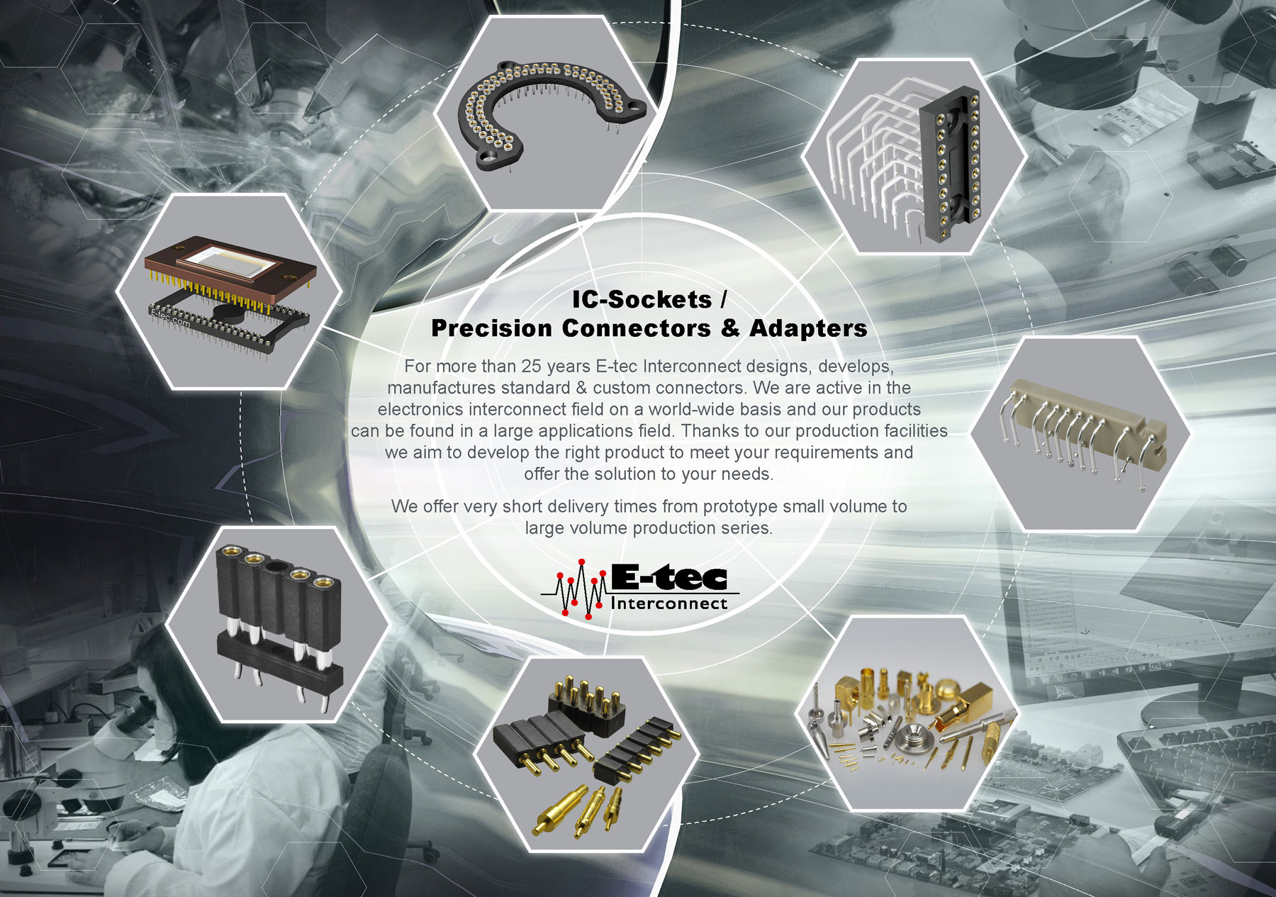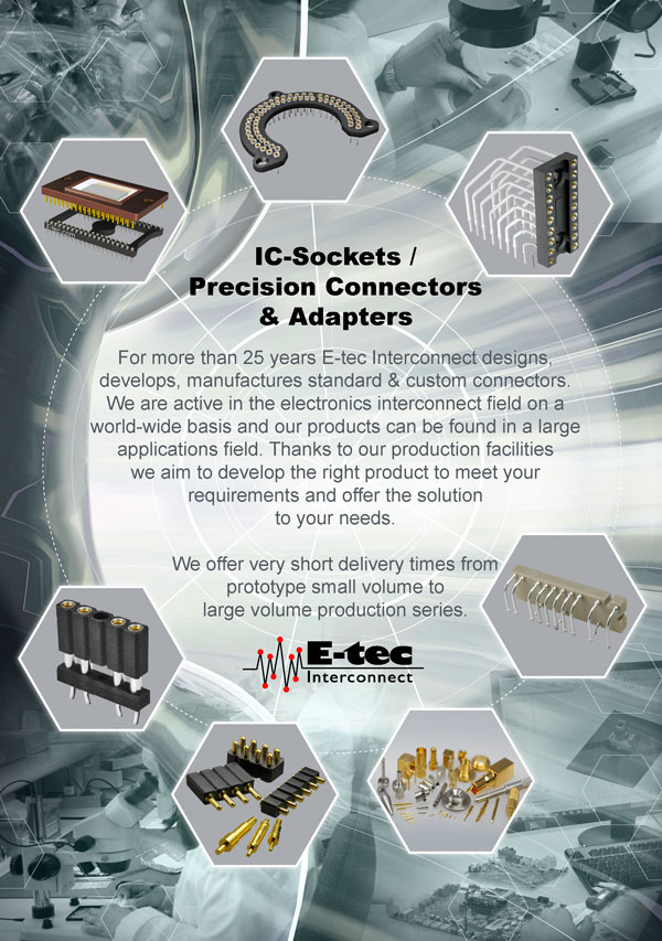 For more than 45 years E-tec Interconnect designs, develops, manufactures standard & custom connectors. We are active in the electronics interconnect field on a world-wide basis and our products can be found in a large applications field. Thanks to our production facilities we aim to develop the right product to meet your requirements and offer the solution to your needs.