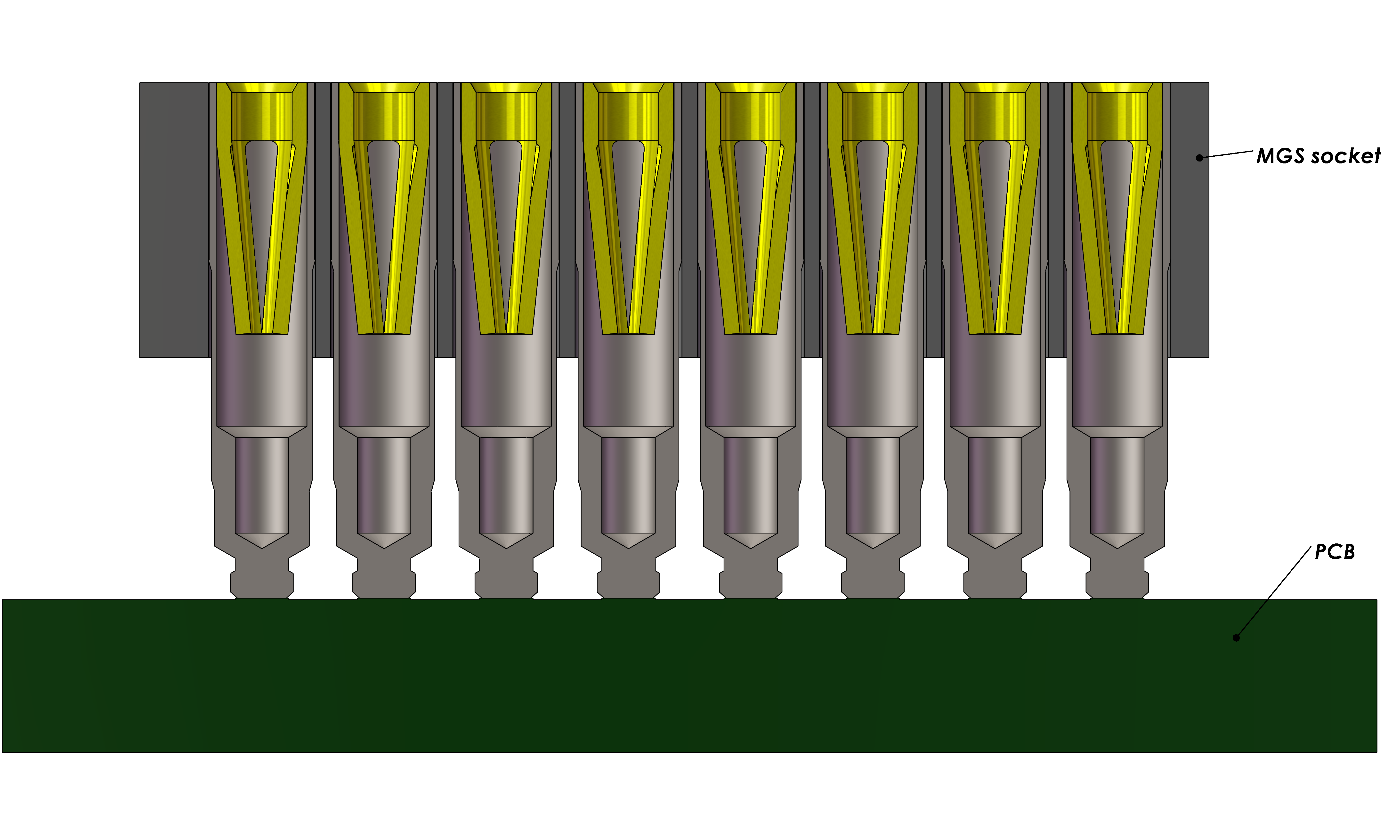 MGS MiniGrid Socket SMT hole precision turned contacts, High temp Insulator Epoxy. Pitch 0.80 to 2.00 mm available, other on request. Possibility to have any pin-out, configuration and grid size adapted to the chip and customer requirements. Open frame socket bodies are also available on request. Special terminal designs are possible on request also. Platings Tin/Gold, Tin/Tin or Gold/Gold.