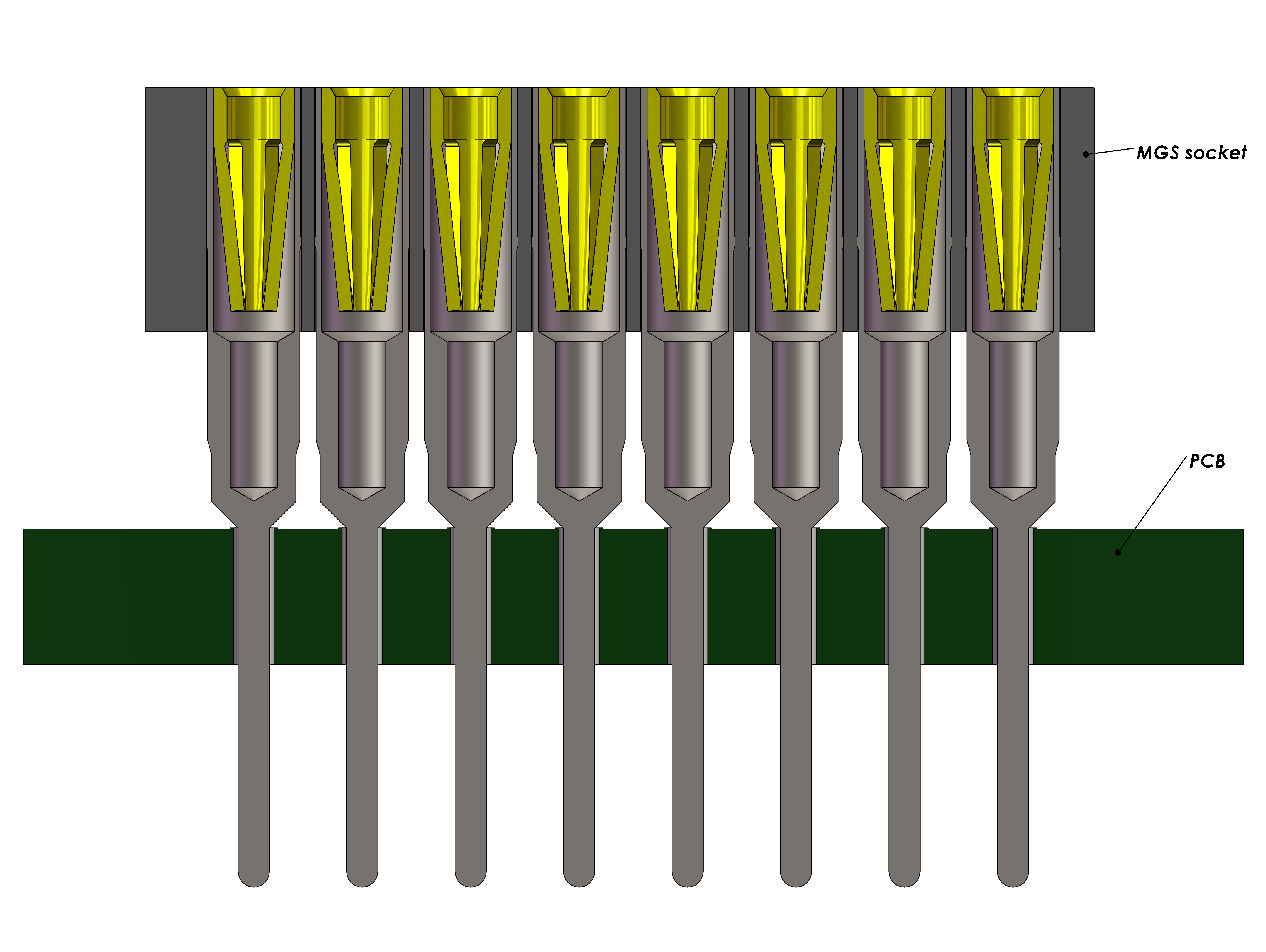 MGSxxx-Exxx-xxX95xx MGS MiniGrid Socket THT Through hole precision turned contacts, High temp Insulator Epoxy. Pitch 0.80 to 2.00 mm available, other on request. Possibility to have any pin-out, configuration and grid size adapted to the chip and customer requirements. Open frame socket bodies are also available on request. Special terminal designs are possible on request also. Platings Tin/Gold, Tin/Tin or Gold/Gold. |