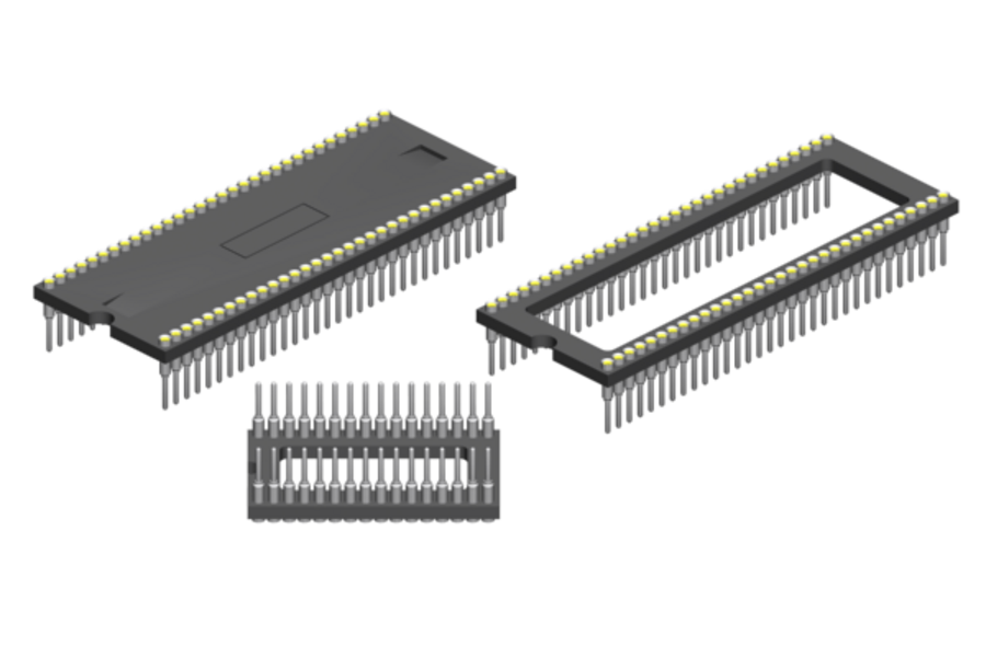 DIP IC-Socket THT Through hole precision turned contacts, supplied with open or closed insulators. 24 to 64 pin versions in pitch 1.778 mm and DIP spacing 10.16 mm (.400"), 15.24 mm (.600") and 19.05 mm (.750"). Different predefined terminals variants according to your needs. Platings Tin/Gold, Tin/Tin or Gold/Gold.