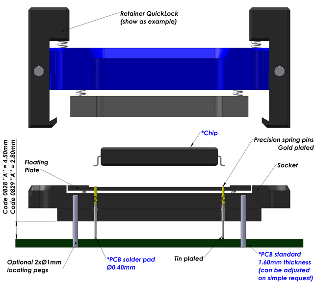 QUM####-082#-######95A# The Raised SMT socket lifts the socket above close-by components on PCB and uses the same footprint as your chip. Socket is simply placed and reflowed onto the PCB in the same way as the chip and it only requires a small amount of additional board space. SMT type sockets are available with all retention systems. We aim to solve your requirements. Please note, we will always request the chip data to ensure we offer a compatible socket. For SMT sockets in general, E-tec Interconnect AG recommends the use of locating pegs, which can be soldered to the PCB for added mechanical strength. |