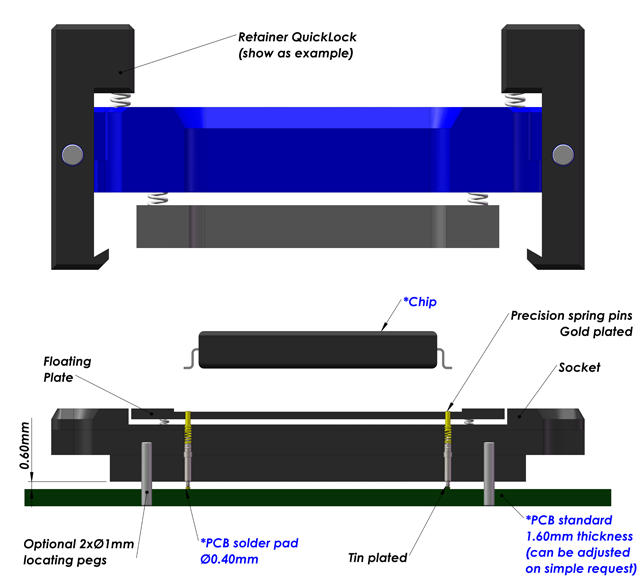 QUM####-0830-######95# The SMT socket uses the same footprint as your chip. Socket is simply placed and reflowed onto the PCB in the same way as the chip and it only requires a small amount of additional board space. SMT type sockets are available with all retention systems. We aim to solve your requirements. Please note, we will always request the chip data to ensure we offer a compatible socket. For SMT sockets in general, E-tec Interconnect AG recommends the use of locating pegs, which can be soldered to the PCB for added mechanical strength. |